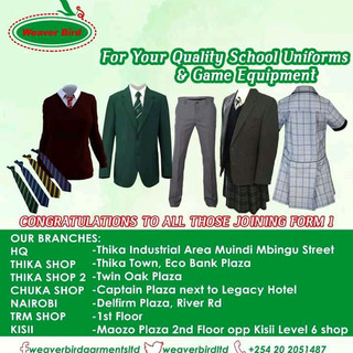 A good education is a FOUNDATION for a better FUTURE. As Kenya prepares for mass admission of new students ,the form ones in the coming new term of the updated school calendar, Weaverbird garments are prepared to give your son and daughter a dope look for good injection of studies at school. Visit their shops to get school uniforms at an affordable prices. At weaverbird Garments, you find this match without really looking for it, and once you find it, you have a permanent definition of your ambitions and future. Shop with Weaverbird and you'll not regret it!!!!
